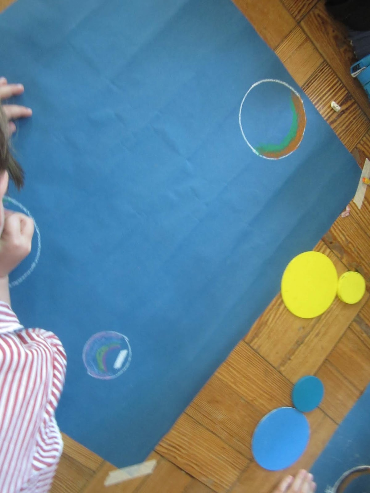 When we had finished our sea creatures we practised our bubble creating skills using oil pastels on long pieces of paper and coloured chalk in the playground - bubblious! These were cut out and added to our classroom displays too.